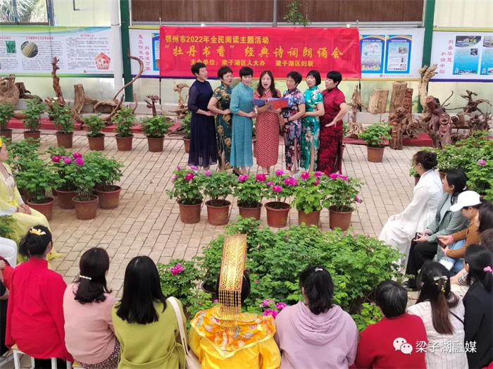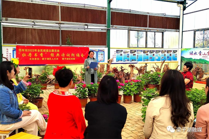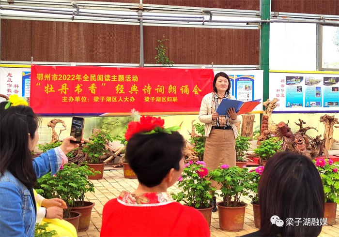 3月29日上午,鄂州市2022年全民阅读主题活动——“牡丹书香”经典诗词朗诵会在沼山镇泉天牡丹花谷举行,来自梁子湖区人大办及区妇联的干部职工近30余人参加活动。