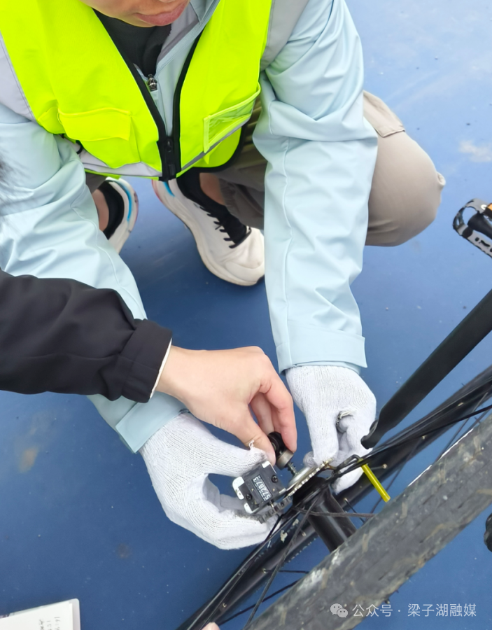 完成琼斯计数器的校准及标前测定后,马良飞老师骑上自行车,从梧桐湖码头起点出发,正式开始赛道丈量工作。