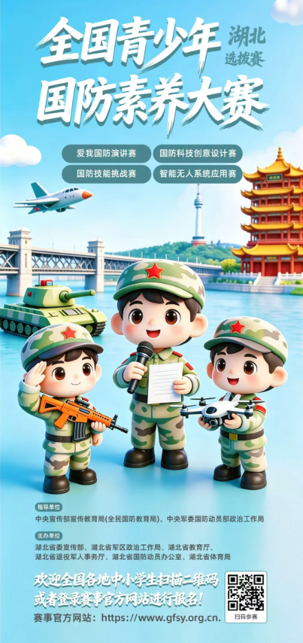 为深入贯彻落实习近平强军思想,全面加强新时代全民国防教育,激发广大青少年爱国拥军、崇军尚武的热情,由中央宣传部宣传教育局(全民国防教育局)、中央军委国防动员部政治工作局指导,湖北省委宣传部、湖北省军区政治工作局、湖北省教育厅等多部门联合主办的全国青少年国防素养大赛湖北选拔赛正式启动!