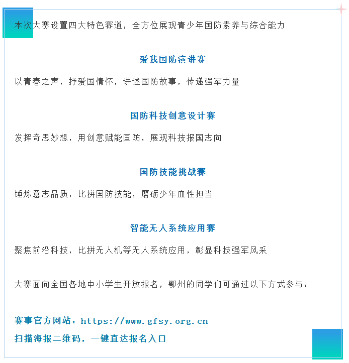 诚邀全市广大中小学生踊跃报名、积极参与,在赛事中学习国防知识、提升国防技能、厚植爱国情怀,以青春之我、奋斗之我,为强国建设、强军事业贡献少年力量!