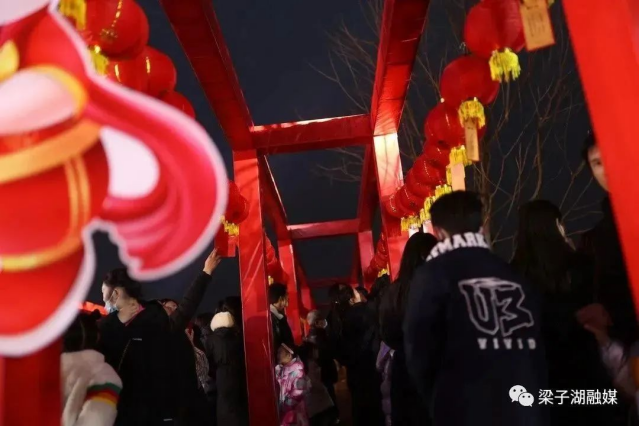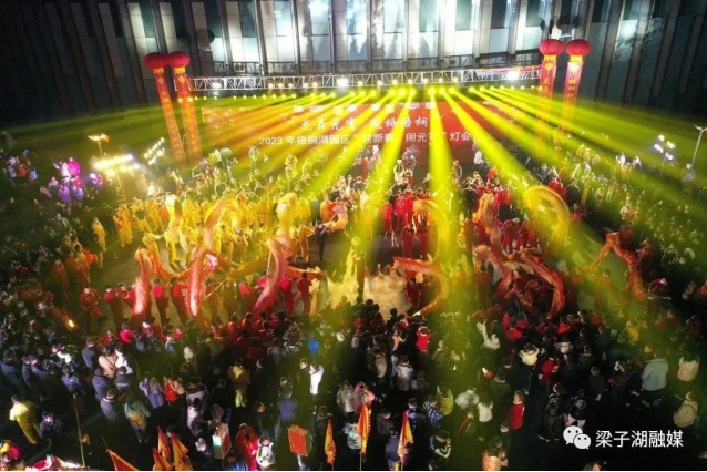 在梧桐湖园区,梁子湖区水生态文明馆前,近2千人共同庆祝元宵佳节。