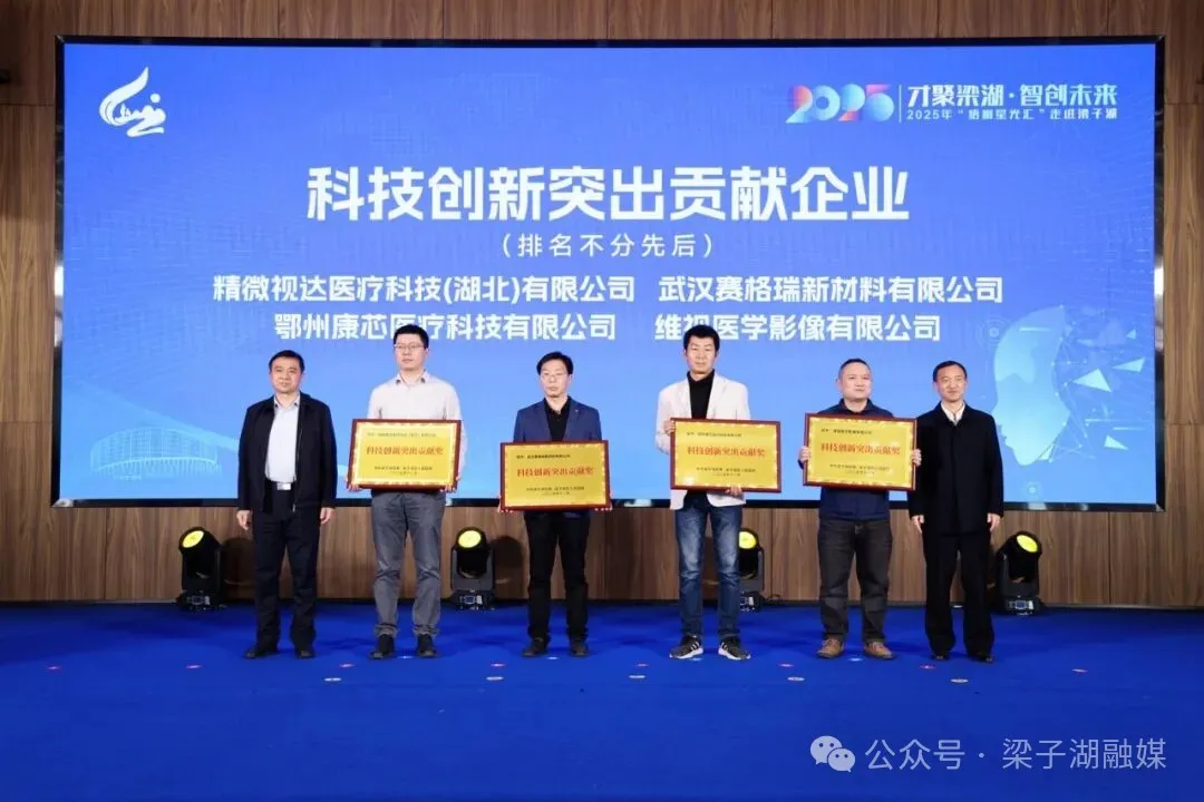 紧接着,区域科技创新企业的荣誉授牌环节让现场氛围再度升温。精微视达医疗科技(湖北)有限公司、武汉赛格瑞新材料有限公司、鄂州康芯医疗科技有限公司、维视医学影像有限公司等四家企业依次登台接受嘉奖,它们在各自领域的创新实践,彰显着梁子湖科创发展的新势能,也让在场人才看到了这片热土的澎湃动力。