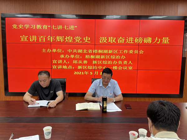 (本网讯)5月25日,梧桐湖新区综治办在新区综治中心一楼会议室开展党史学习教育宣讲活动,新区各村(社区)治调主任、全体网格员、综治办全体人员共同参加本次活动。