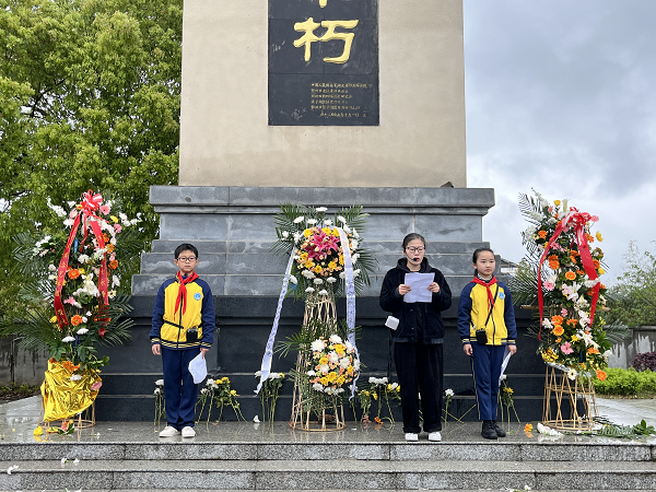 党员教师张文婷讲述了月山战役,月山战斗彻底歼灭了顽军马钦武部,毙伤其300余人,俘数百人,其残部如鸟兽散。新四军缴获各种枪数百支和大批军用物资,但也付出了沉重的代价,伤亡将近200人,其中牺牲近百人,旅部科长熊荣华以下干部多人牺牲,营长贺导海以下干部多人负伤,是他们前仆后继,谱写了一曲曲永垂青史的惊天动地的历史颂歌。他们的英名将光耀千秋;他们的业绩代代传承。带着这样一份敬仰,党员教师、团员和学生代表纷纷为革命先烈献上鲜花。