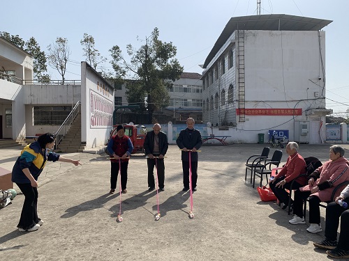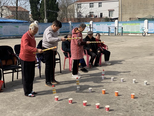 本场活动共设置了四项具有趣味性、简易性、安全性和运动性的小游戏,有锻炼手部力量的“水瓶快跑”“趣味保龄球”,有锻炼眼力的“小猫钓鱼”“投壶”,活动一开始,讲师们先带领老年人做热身操,再讲解示范游戏玩法和三局两胜的规则。在游戏中,老人们“大显身手”,将不服输、不服老的精神展现得淋漓尽致,同时热烈的游戏氛围感染了在场的每一个人,活动场上不时传来喝彩声和鼓掌声。