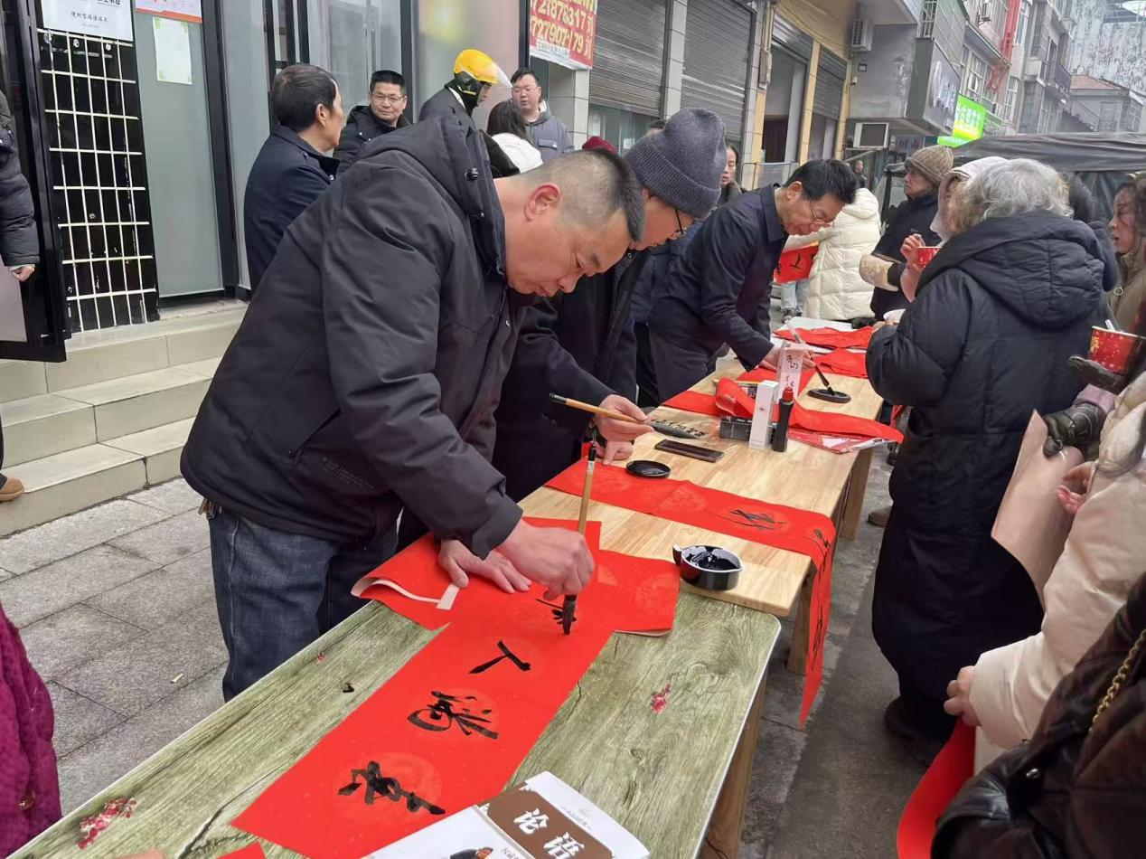 驿站外的写春联专区同样热闹非凡,社区书法爱好者们挥毫泼墨,将“平安喜乐”“龙马精神”等美好祝福凝聚在红纸上。居民们手持刚写好的春联与福字,脸上洋溢着喜悦,现场年味十足。