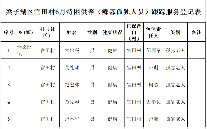 梁子湖区官田村6月特困供养(鳏寡孤独人员)跟踪服务登记表