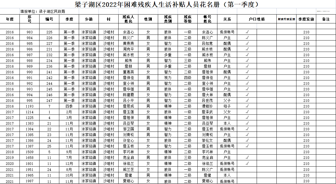 梁子湖区2022年困难残疾人生活补贴人员花名册(第一季度)