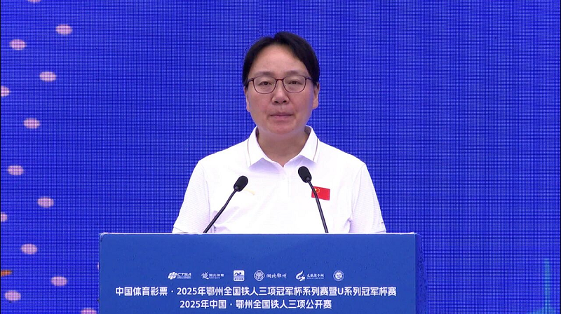 在庄严的国歌声后,鄂州市副市长、华容区委书记任蔚致欢迎辞。她表示,铁人三项赛与梁子湖的相遇,是自然禀赋与体育精神的美好结合,更是鄂州推动体旅融合、打造运动之城的重要契机。