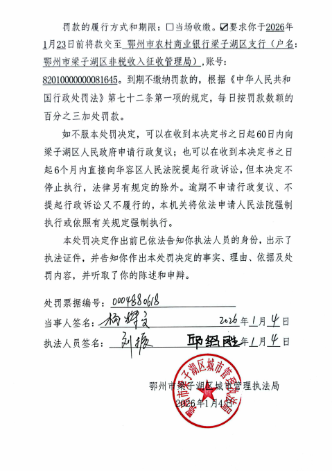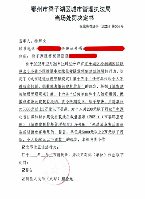 鄂州市梁子湖区城市管理执法局当场处罚决定书 梁城当罚决字〔2025〕第006号