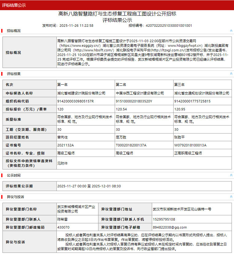 高新八路智慧路灯与生态修复工程施工图设计评标结果公示