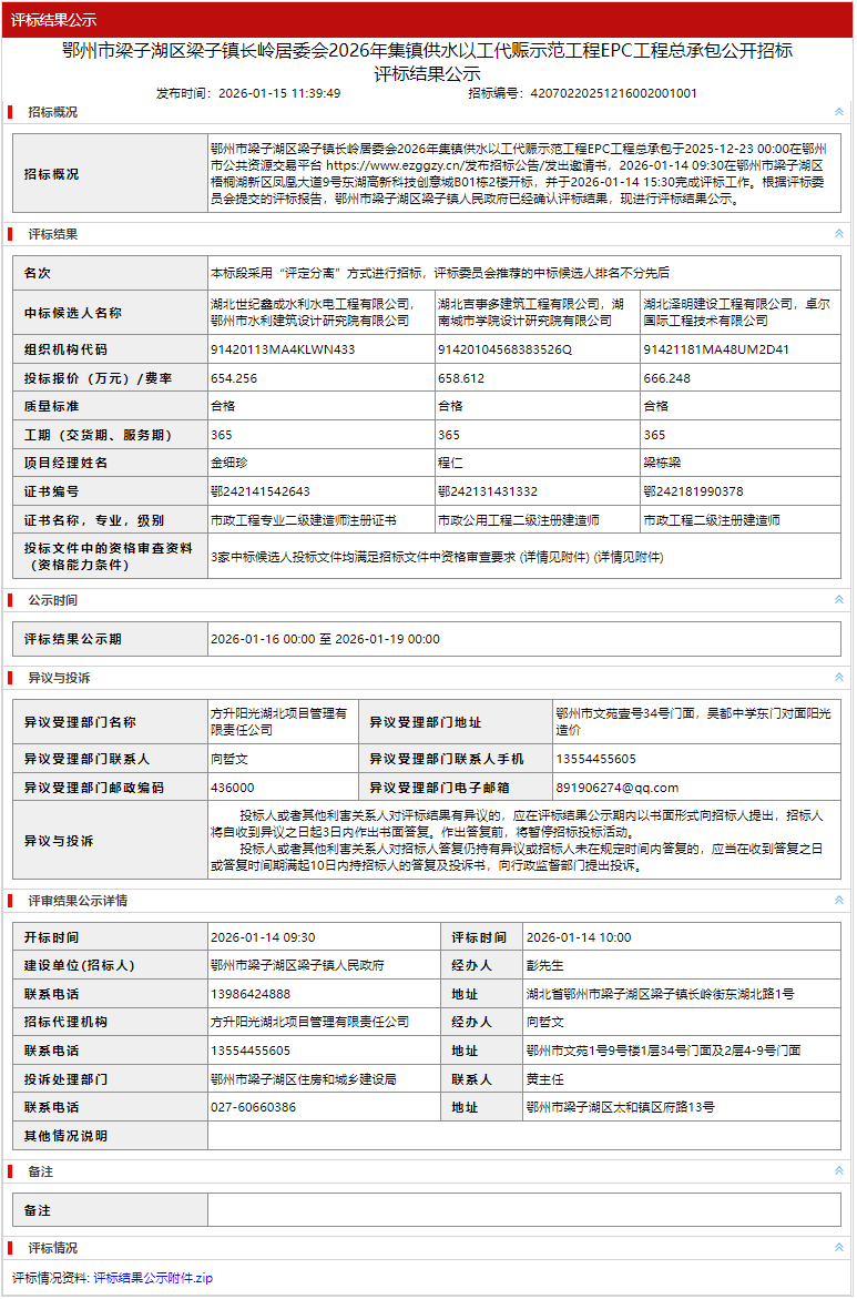 鄂州市梁子湖区梁子镇长岭居委会2026年集镇供水以工代赈示范工程EPC工程总承包评标结果公示