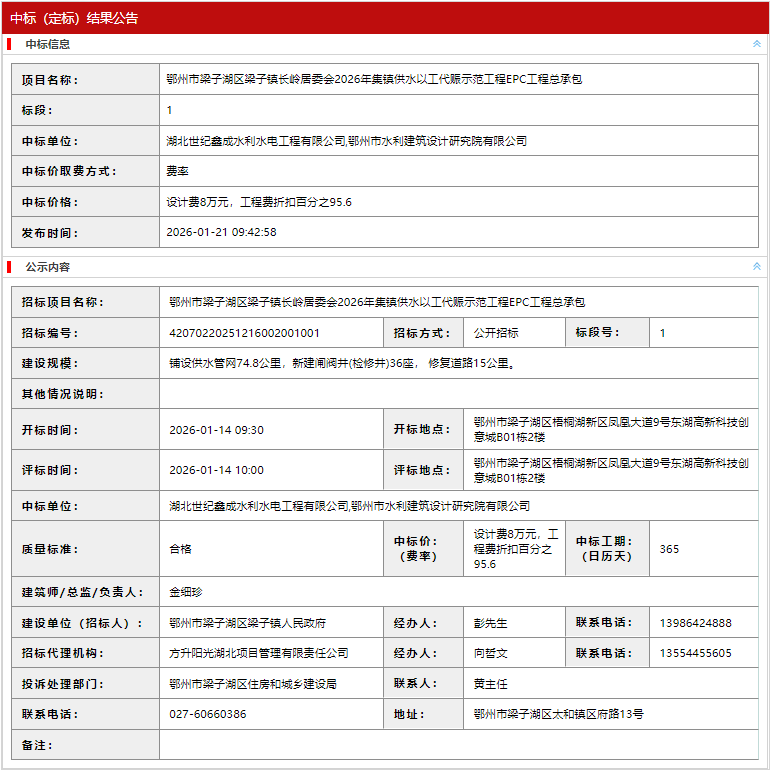 鄂州市梁子湖区梁子镇长岭居委会2026年集镇供水以工代赈示范工程EPC工程总承包中标(定标)结果公告