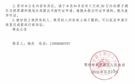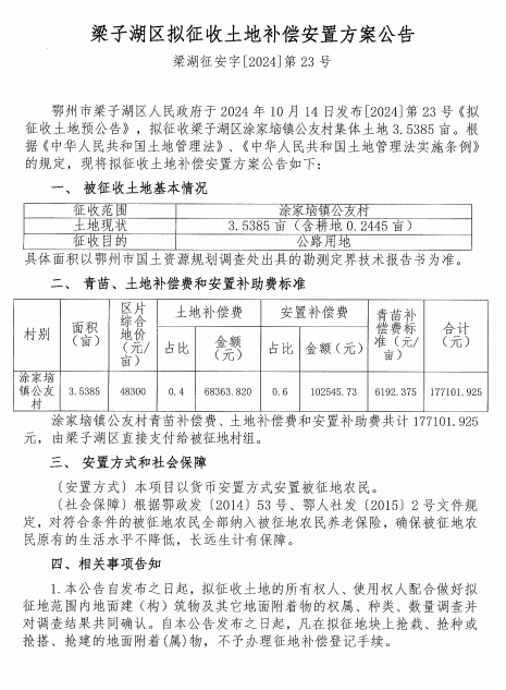 梁子湖区拟征收土地补偿安置方案公告 梁湖征安字[2024]第23号