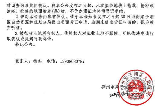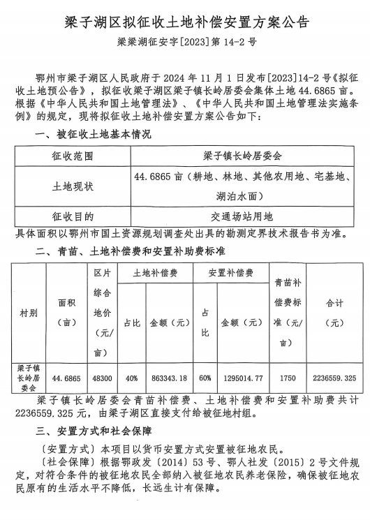 梁子湖区拟征收土地补偿安置方案公告 梁梁湖征安字[2023]第14-2号