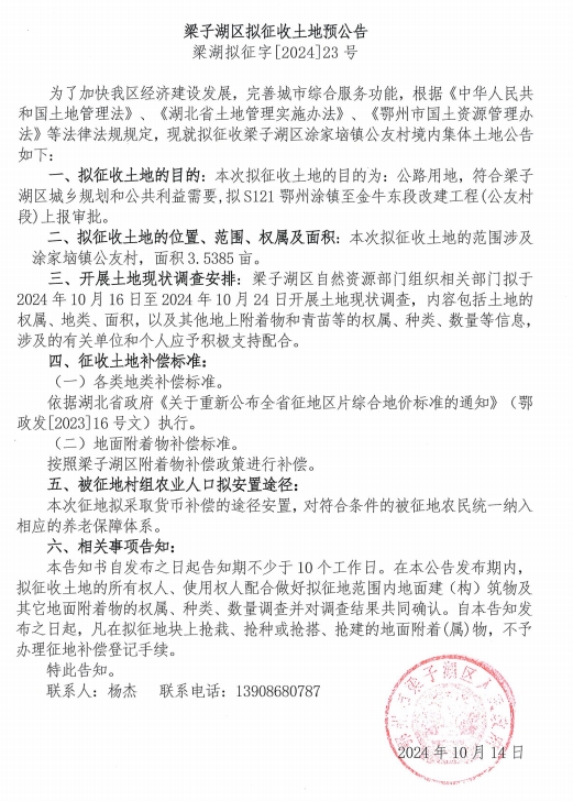 梁子湖区拟征收土地预公告 梁湖拟征字[2024]23号