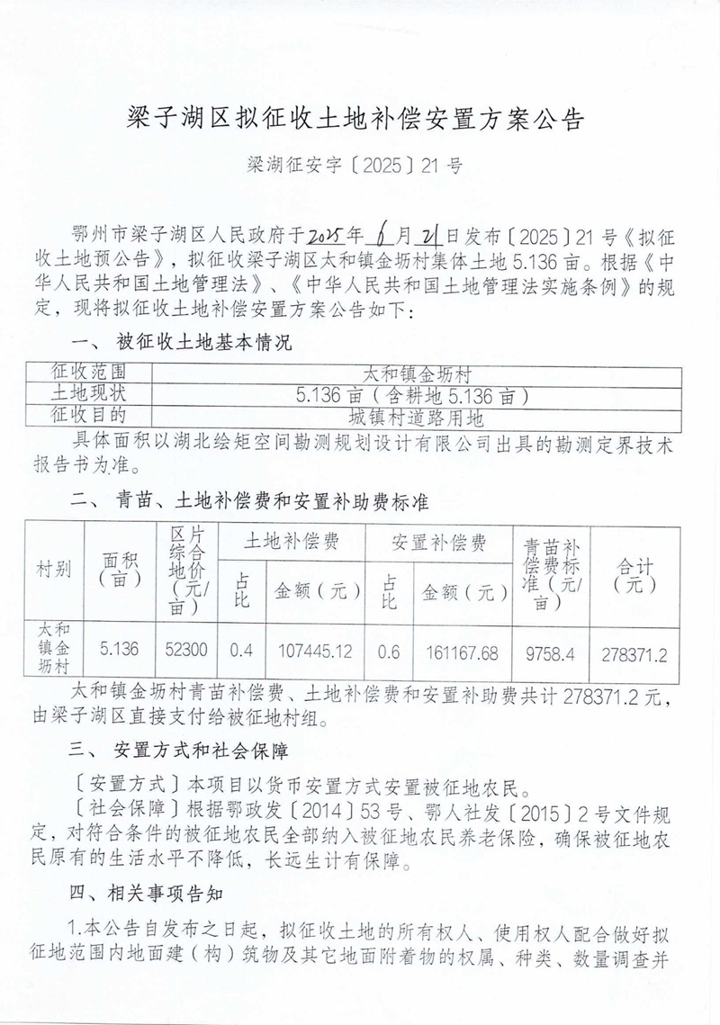 梁子湖区拟征收土地补偿安置方案公告 梁湖征安字〔2025〕21号