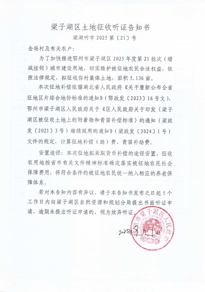 梁子湖区土地征收听证告知书 梁湖听字2025第〔21〕号