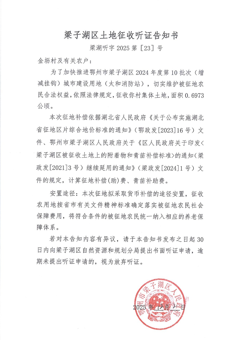 梁子湖区土地征收听证告知书 梁湖听字2025第〔23〕号