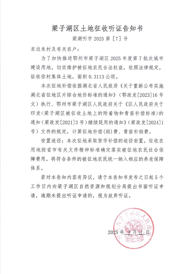 梁子湖区土地征收听证告知书 梁湖听字2025第〔7〕号