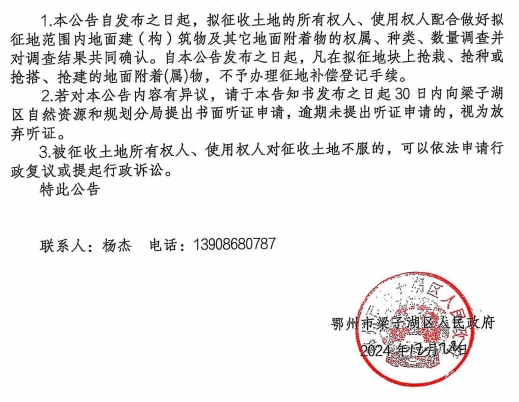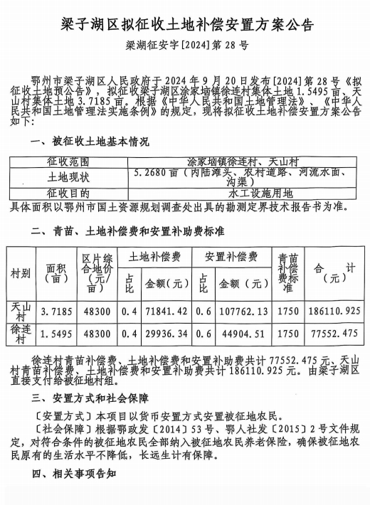 梁子湖区拟征收土地补偿安置方案公告 梁湖征安字[2024]第28号