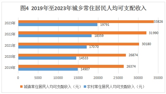 全年全区全体居民人均可支配收入26220元,同比增长6.6%。按常住地分,全区城镇常住居民可支配收入完成33826元,同比增长5.7%;农村常住居民可支配收入完成19791元,同比增长7.8%,农村增速快于城镇增速2.1个百分点。我区城乡居民可支配收入比为1.71,较2022年同期缩小0.03。