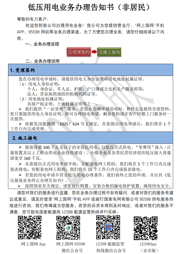 2025年低压非居民用电业务办理告知书