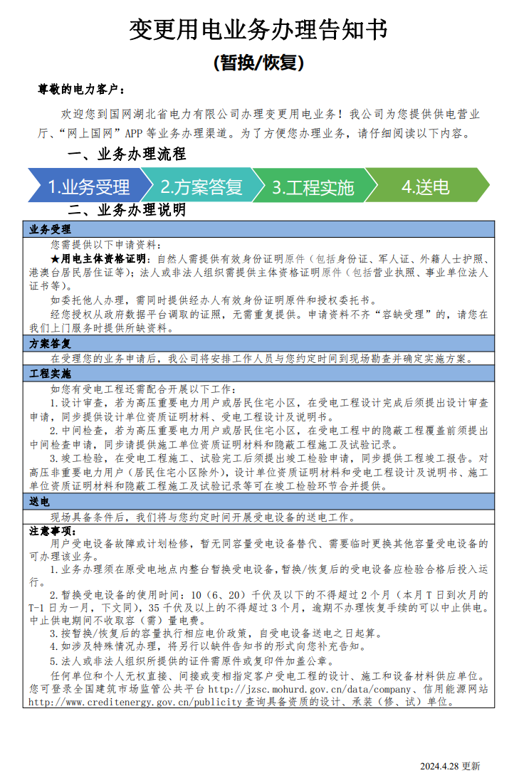 变更用电业务办理告知书——暂换恢复