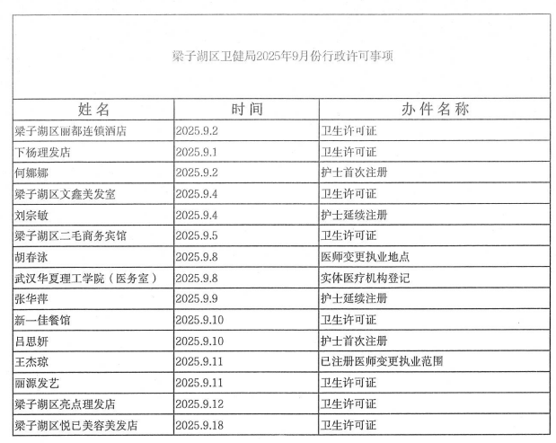 梁子湖区卫健局2025年9月份行政许可事项