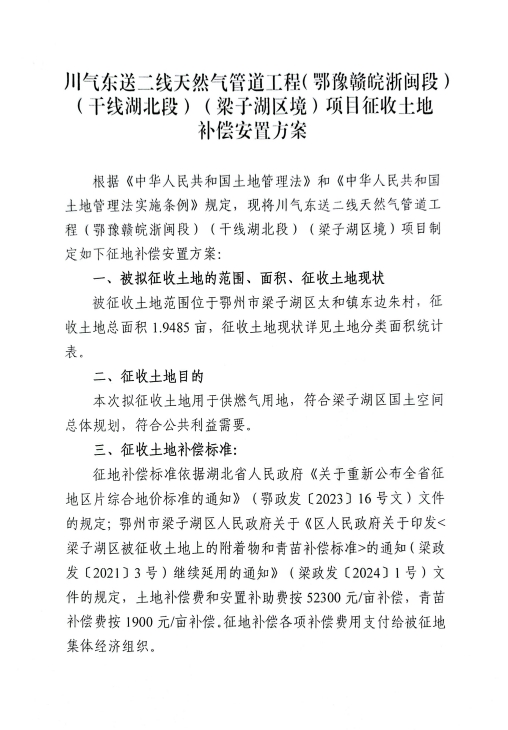 川气东送二线天然气管道工程(鄂豫赣皖浙闽段) (干线湖北段)(梁子湖区境)项目征收土地补偿安置方案