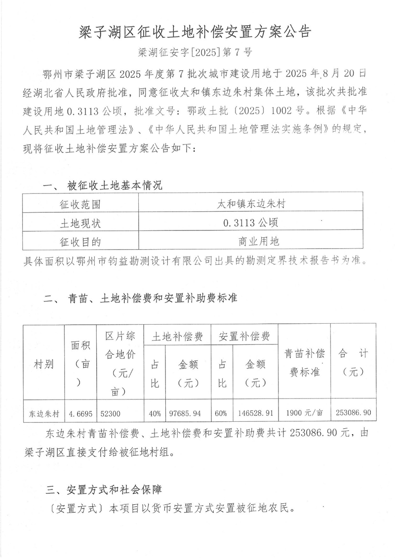 梁子湖区征收土地补偿安置方案公告 梁湖征安字〔2025〕第7号