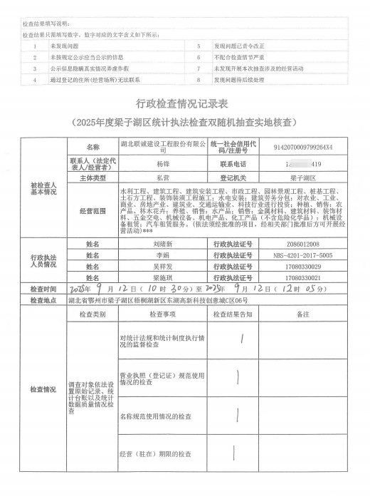 梁子湖区统计局“双随机、一公开”执法检查-湖北联诚检查情况表