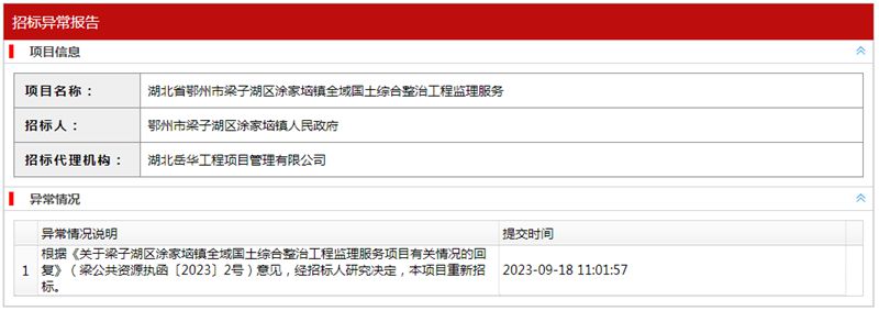 湖北省鄂州市梁子湖区涂家垴镇全域国土综合整治工程监理服务招标异常报告