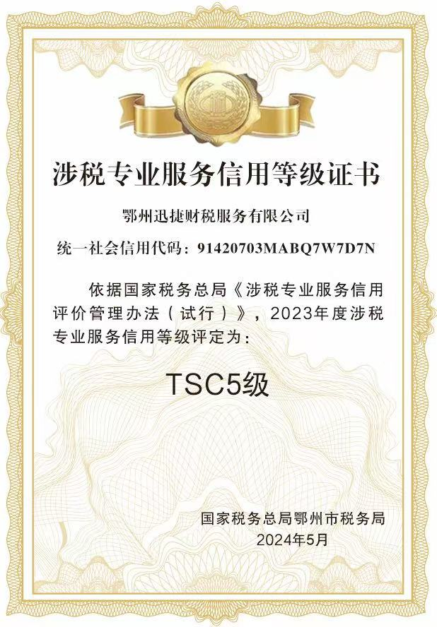 为推进社会信用体系建设,促进涉税专业服务机构依法诚信执业,根据国家税务总局鄂州市税务局关于印发《涉税专业服务机构信用评价办法(试行)》的通知规定,国家税务总局鄂州市税务局对辖区内纳入实名制管理的涉税专业服务机构2023年度涉税专业服务信用情况进行了评价,其中鄂州迅捷财税服务有限公司被评为涉税专业服务信用等级TSC5级(最高级)。